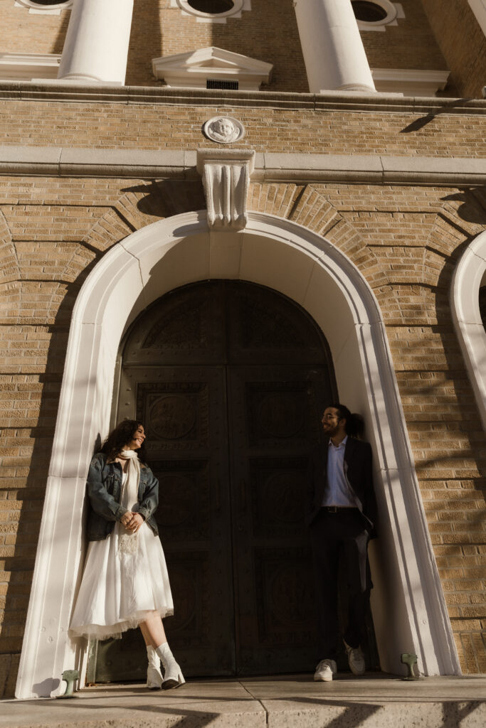 We began their engagement session at Annunciation Cathedral, a place that holds deep meaning for them. While the cathedral itself was closed when we arrived, it did not take away from the moment. The exterior, the light, and the quiet reverence of the space still grounded the start of the session.