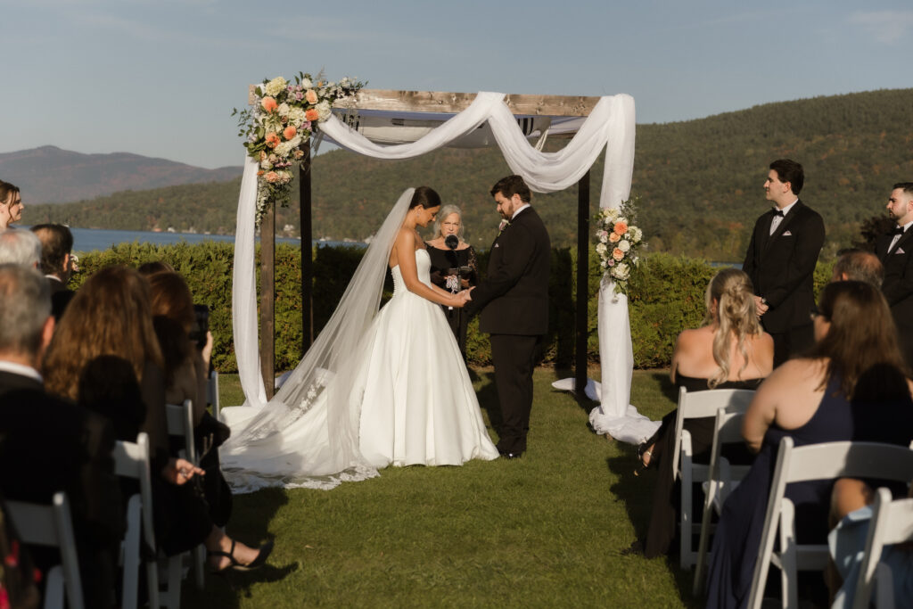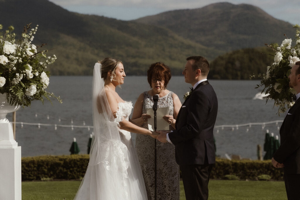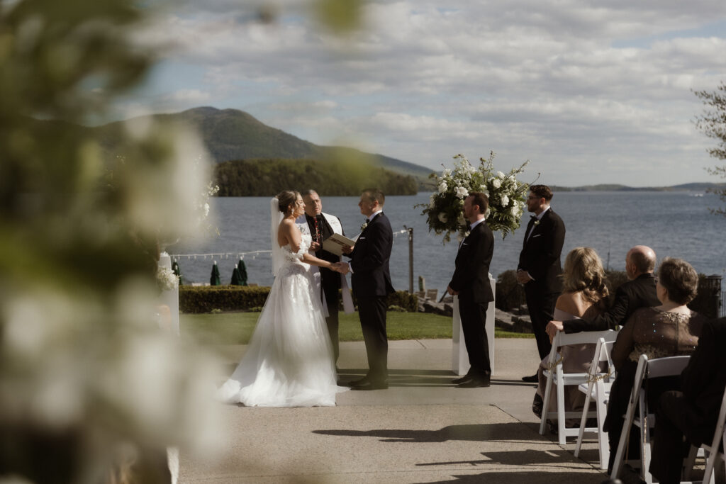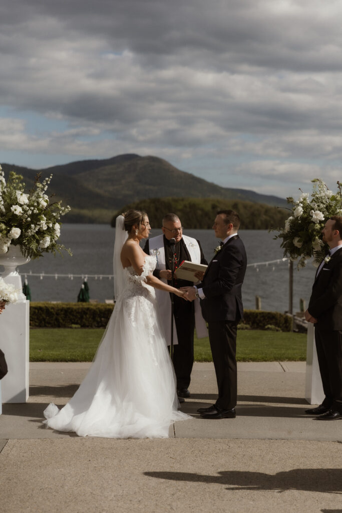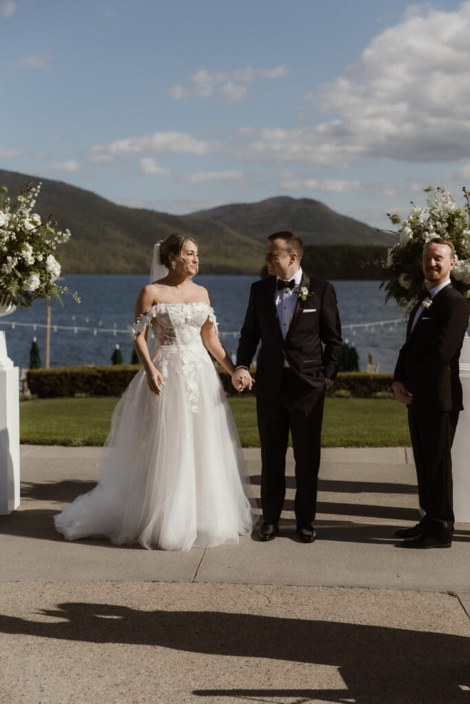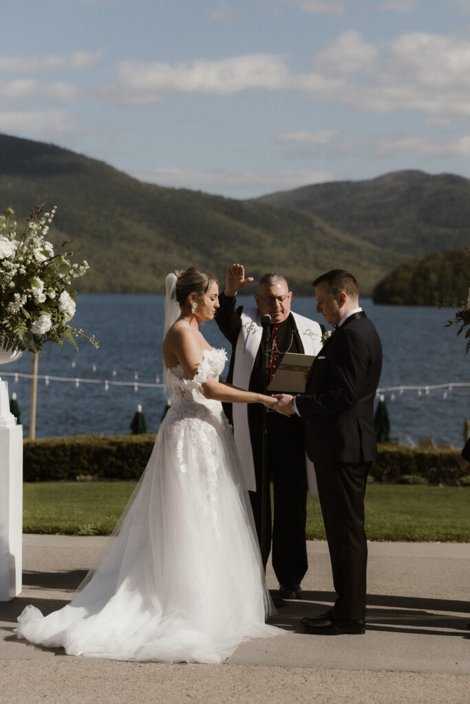 Nicole and Tyler exchanged vows during an outdoor ceremony on the Veranda Terrace at The Sagamore Resort. Lake George stretched out behind them. The ceremony began at 4:30pm and unfolded exactly as they had hoped—peaceful, romantic, and present.
