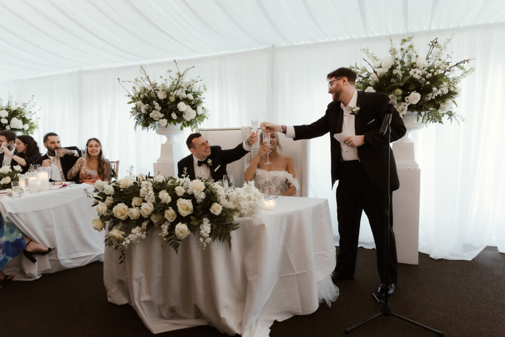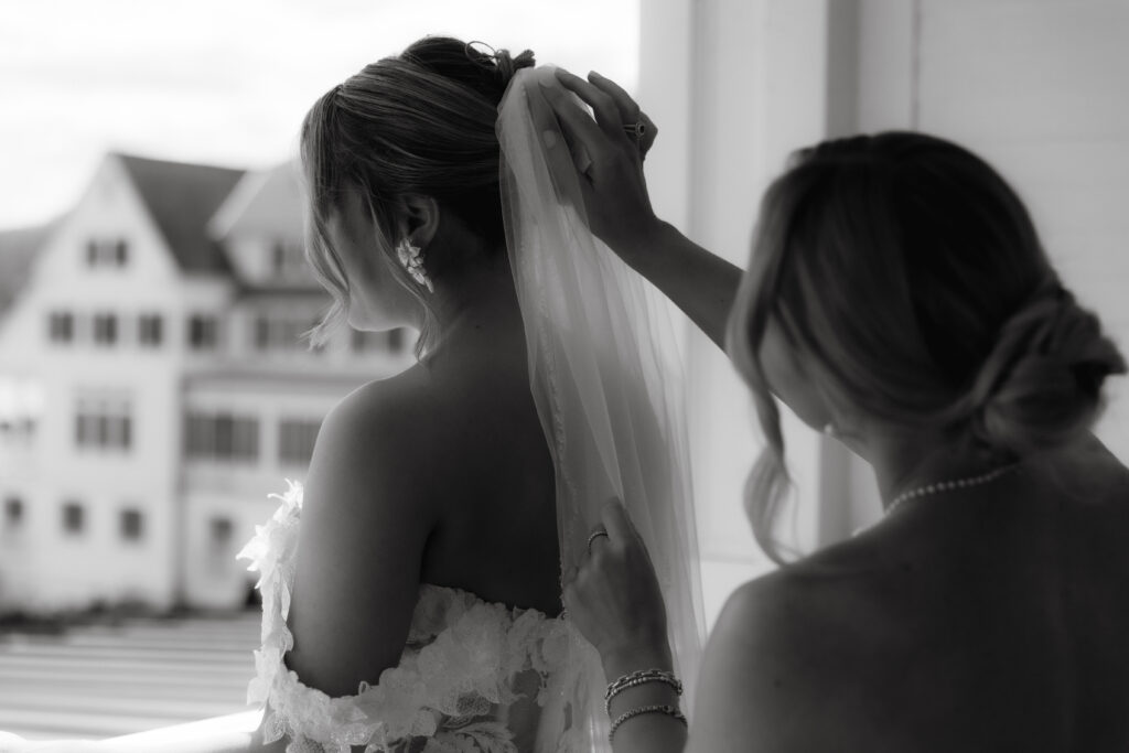 The getting ready part of the day was calm and meaningful. Parents and siblings were there, helping with final touches and sharing quiet moments before the ceremony. A champagne toast marked the transition into the day. It was one of those small pauses that makes a wedding morning feel real and grounded.