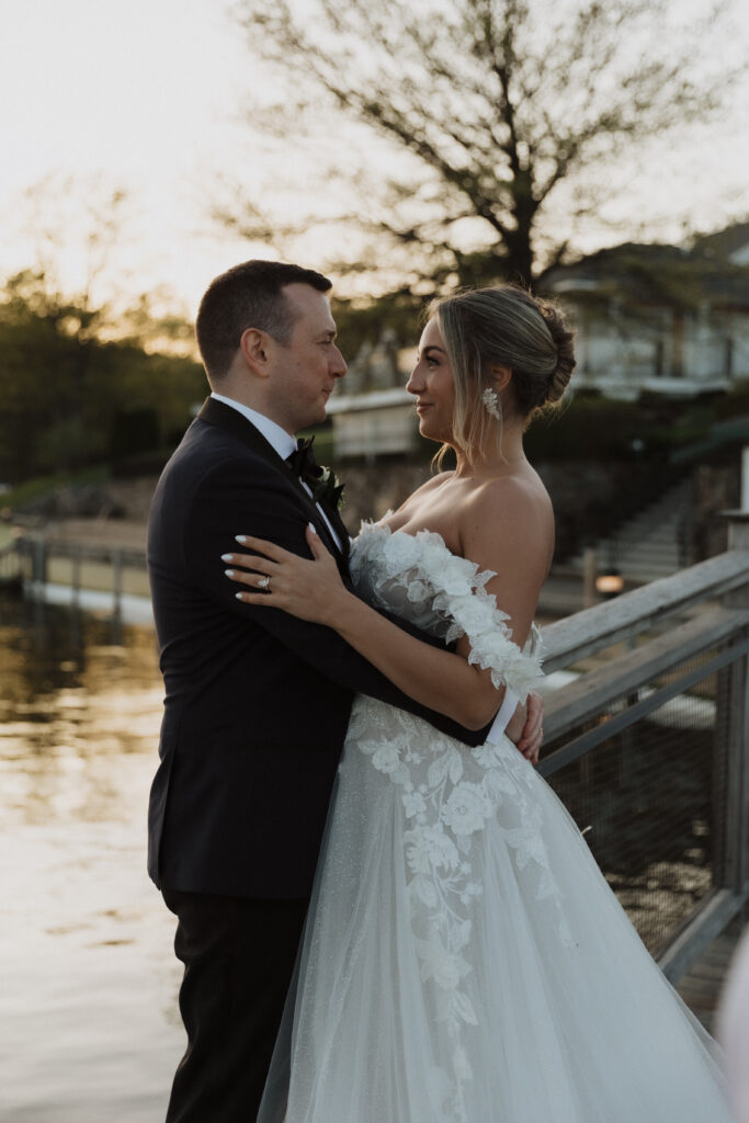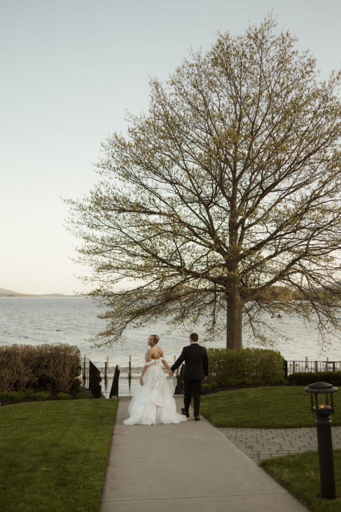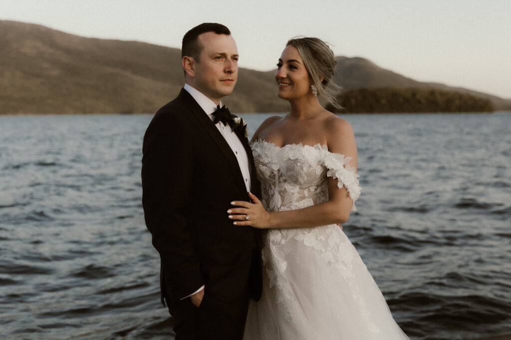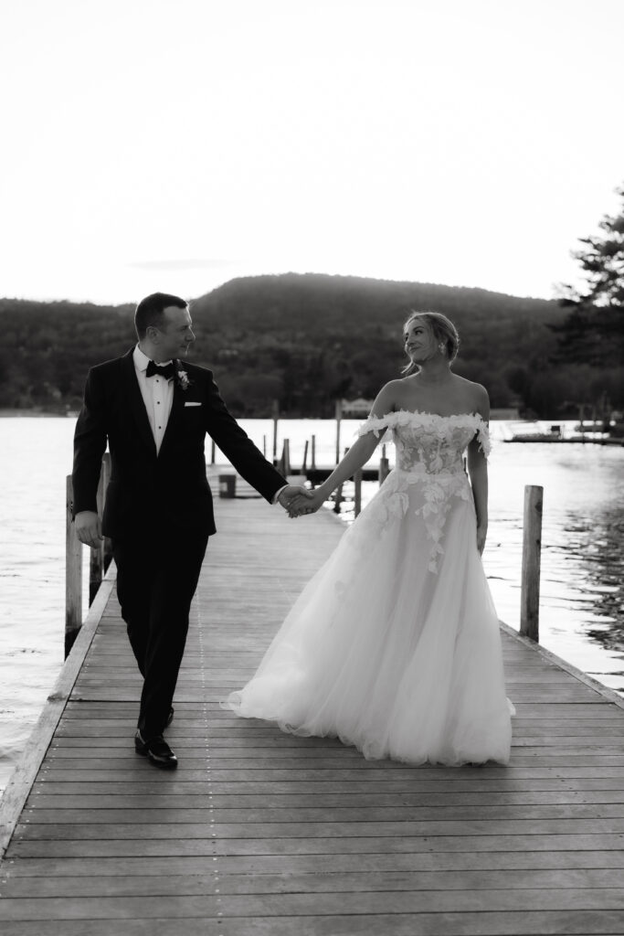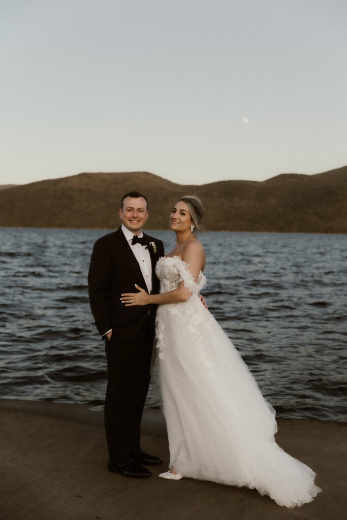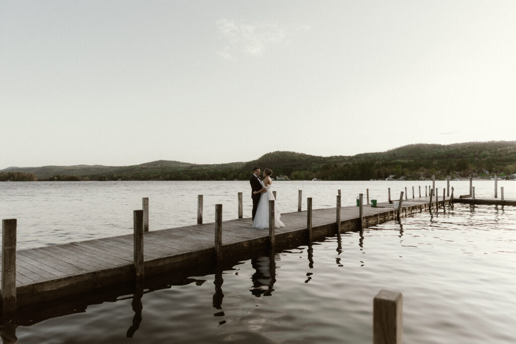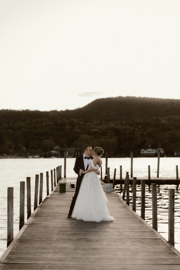 As the sun dipped lower over Lake George, Nicole and Tyler stepped away briefly for golden hour portraits. They enjoyed the soft light and water reflections. It was a few quiet minutes together in the middle of the celebration.